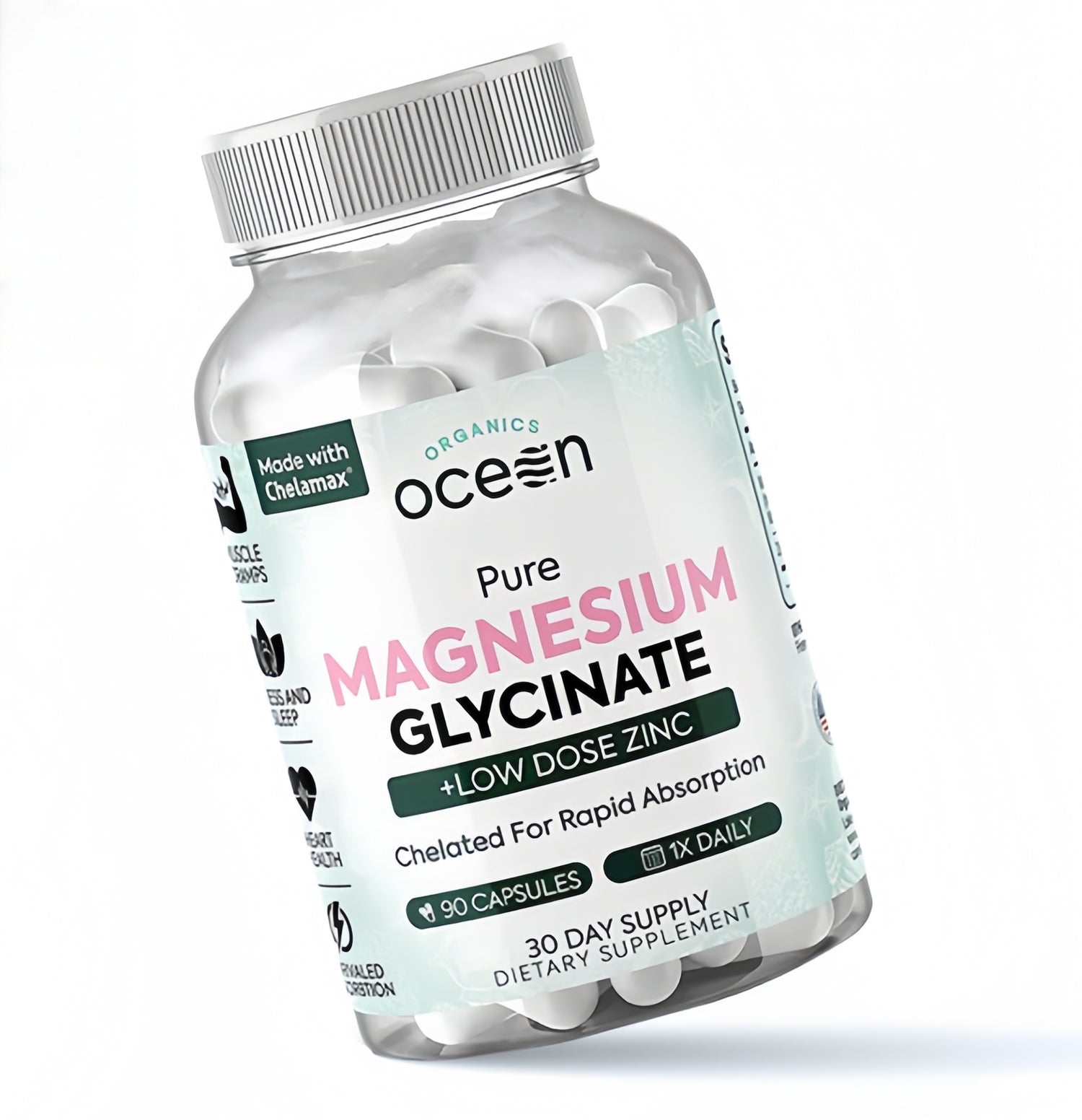 Organics Ocean Magnesium Glycinate delivers a pure, optimal dose of pharmaceutical-grade chelated magnesium glycinate and zinc. Sourced from the mineral-rich Dead Sea and chelated in Utah, each 275mg serving provides 40% more magnesium in capsules 50% smaller than average. This ensures unmatched purity, absorption, and results.